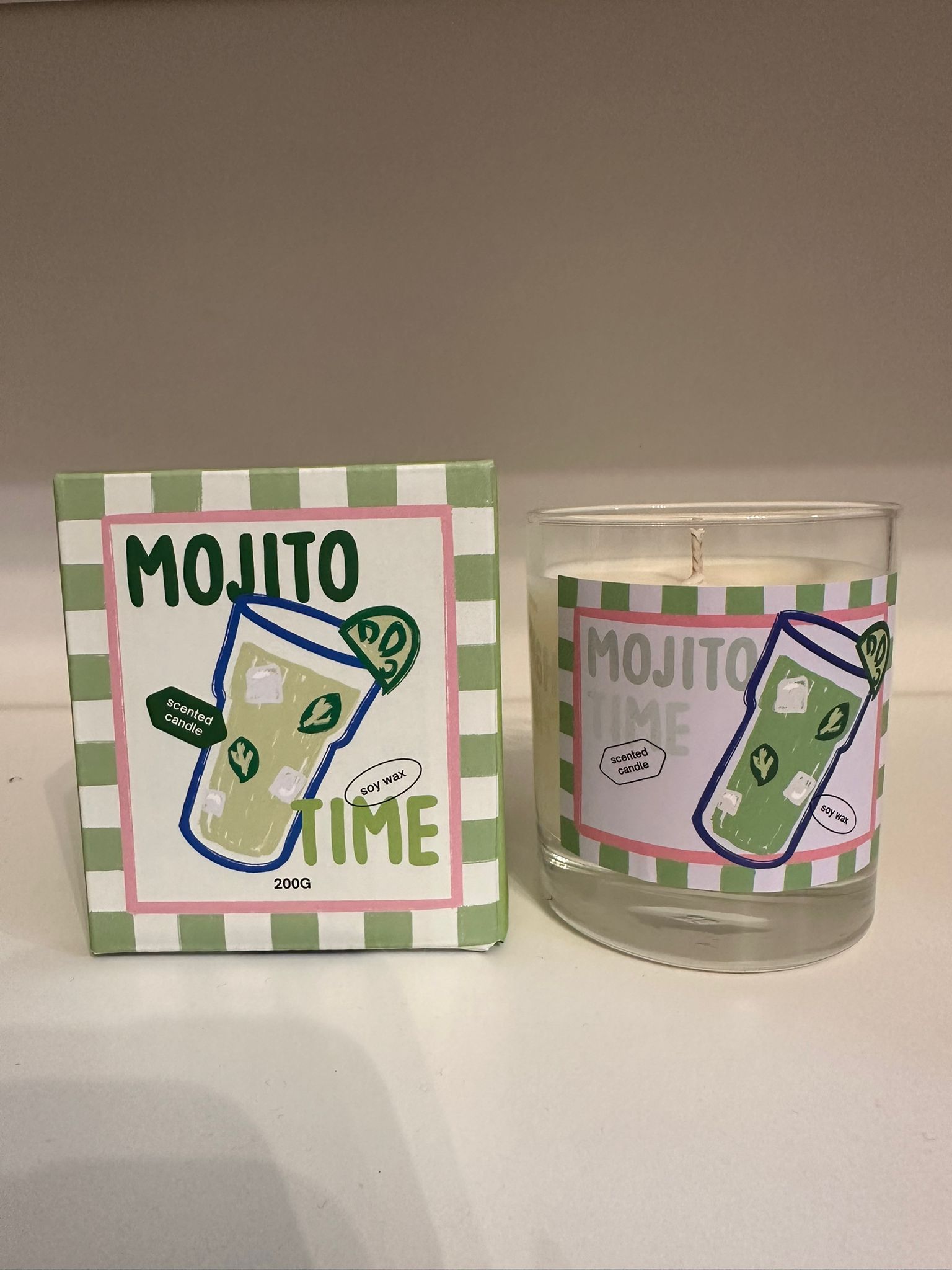Il design è essenziale e raffinato: un bicchiere di vetro trasparente che lascia parlare il colore naturale della cera, racchiuso in un packaging illustrato che racconta la storia della fragranza al suo interno.