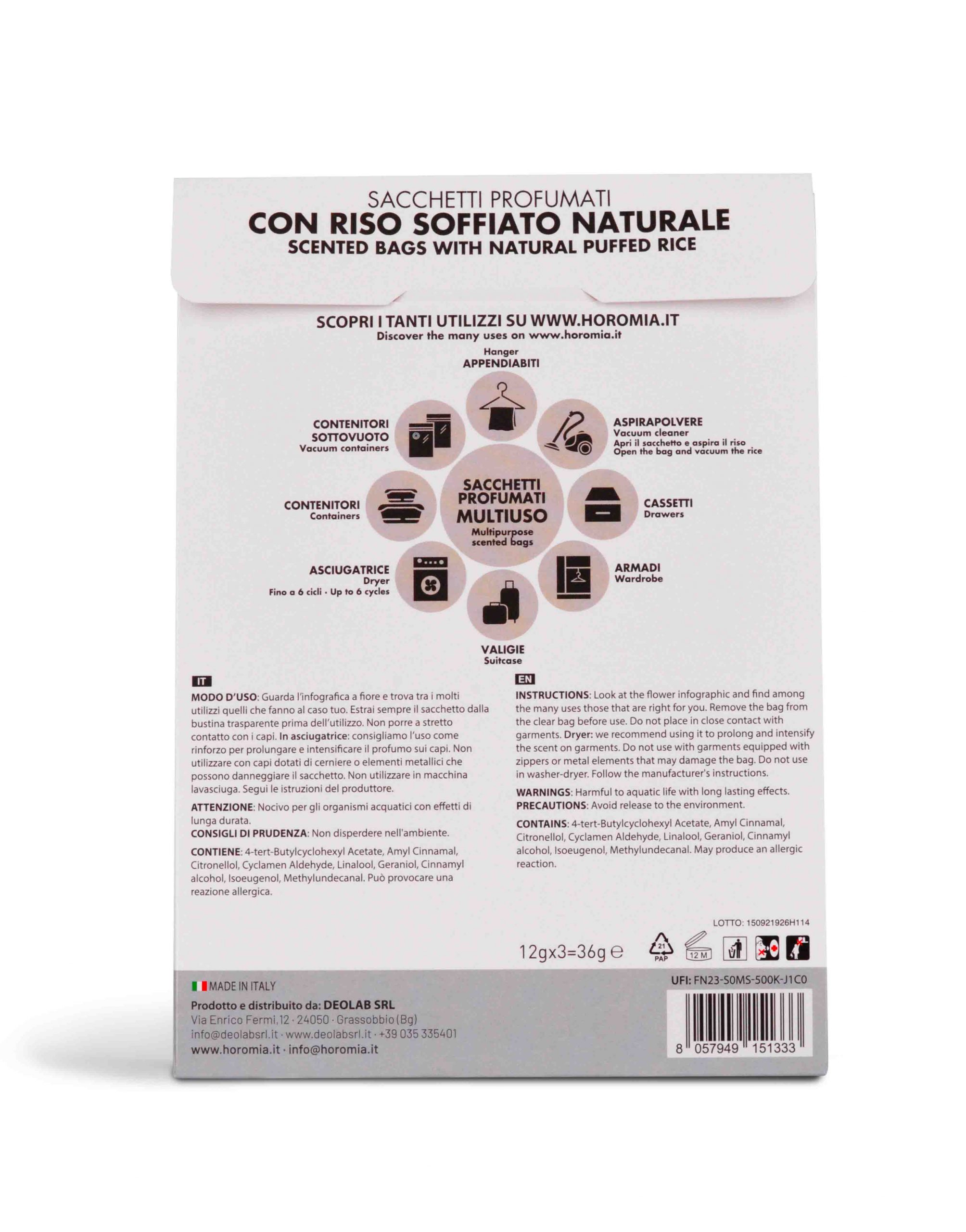 L’unicità e l’intensità delle fragranze Horomia ora in Sacchetti Profumati Multiuso. Creati con riso soffiato naturale non alimentare, i sacchetti profumati Horomia sono formulati per donare ai tuoi capi e alla tua casa il profumo unico e inconfondibile della tua fragranza preferita. Ogni confezione contiene tre sacchetti profumati avvolti in una busta trasparente ad alta protezione, per un profumo intenso e duraturo fino a 12 settimane.