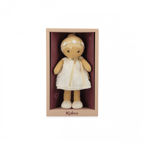 È ora di conoscere Daphne: una bellissima ed elegante bambola di stoffa da 25 cm! Adatta ai neonati, fa parte della collezione di bambole Tendresse di Kaloo. Elegantemente vestita con un abito in organza avorio a pois, Daphne è pronta a celebrare momenti preziosi come un battesimo o un matrimonio. La sua splendida acconciatura aggiunge un tocco di distinzione e le scarpe abbinate completano il suo look raffinato ed elegante. Daphne è una bambola che riflette la purezza e la dolcezza dei momenti preziosi. Il suo abito etereo è impreziosito da una delicata coroncina di fiori, come un tocco finale di poesia. Con il suo sguardo sereno e il suo aspetto delicato, Daphne invita alla dolcezza e alla fantasia. Sembra uscita da un momento sospeso, dove il silenzio lenisce e i gesti teneri confortano. Incarna quei momenti di calma in cui ci prendiamo il tempo di sentire, come una leggera brezza che accarezza la pelle. Incredibilmente morbida, è facile da afferrare per le manine e diventa rapidamente la perfetta compagna di coccole. Discreta e affascinante, Daphné si integra naturalmente nella vita quotidiana di ogni bambino. Un piccolo nastro cucito sulla schiena permette di scrivere il nome del bambino, rendendola un’amica unica e preziosa. Presentata in una graziosa scatola, è un regalo originale per neonati, pieno di dolcezza e fantasia. È perfetta anche come prima bambola per stimolare l’immaginazione dei più piccoli. Realizzata con cura, questa bambola di stoffa è realizzata con almeno l’80% di materiali riciclati, inclusa l’imbottitura in poliestere riciclato. Lavabile in lavatrice a 30°C, questa adorabile bambola è pronta per essere adottata e amata per gli anni a venire!