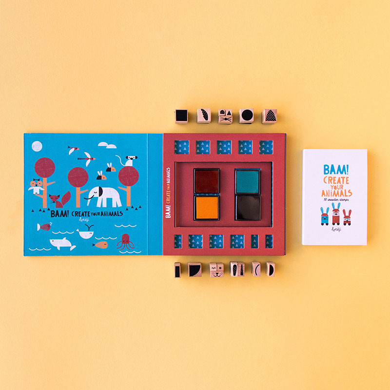 Combinando i nostri timbri, nasceranno leoni, elefanti, balene, pesci e giraffe! Il gioco include 16 timbri in legno e 4 tamponi di inchiostro colorati. È incluso anche un quaderno per inventare i tuoi disegni più stravaganti!