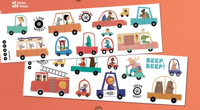 Scopri i tatuaggi Beep Beep! con auto divertenti e tante scene da esplorare. Lasciati trasportare e crea le tue avventure su ruote.