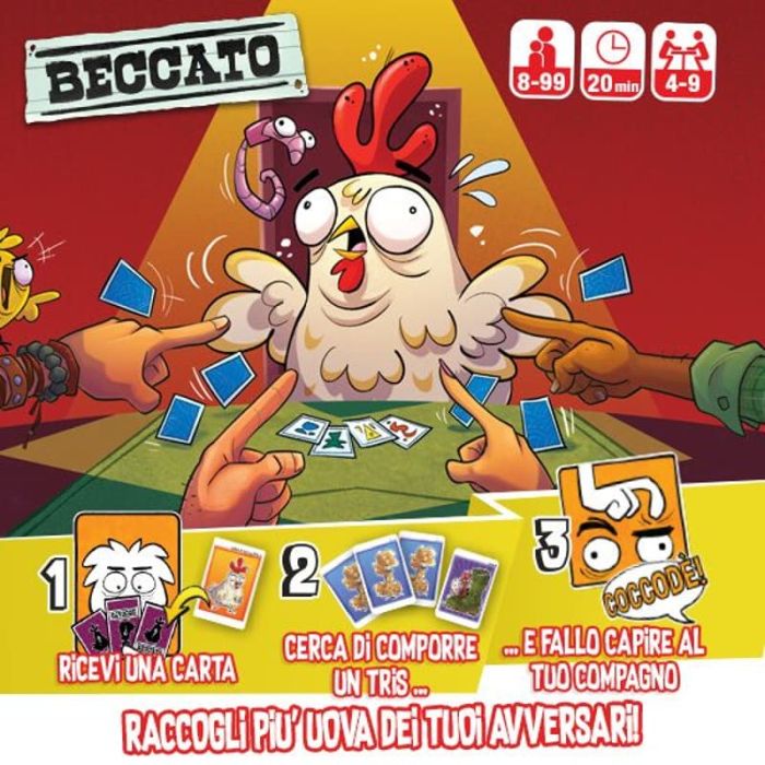 In questo avvincente party game, il tuo obiettivo è raccogliere più uova dei tuoi avversari. Ma attenzione, la chiave del successo è nei gesti furtivi e negli sguardi eloquenti. Dovrai far capire al tuo compagno di squadra le carte che hai in mano attraverso un segnale segreto, senza farti scoprire dagli avversari. Beccato è un gioco che mette alla prova la tua capacità di comunicare in modo sottile e quasi telepatico.